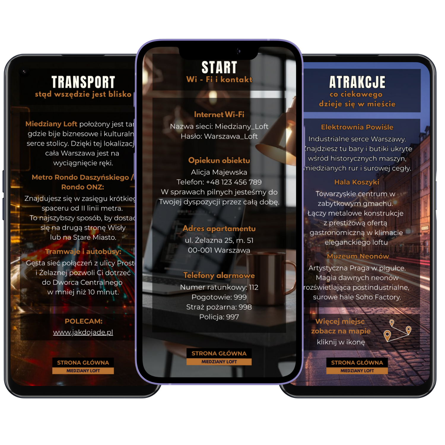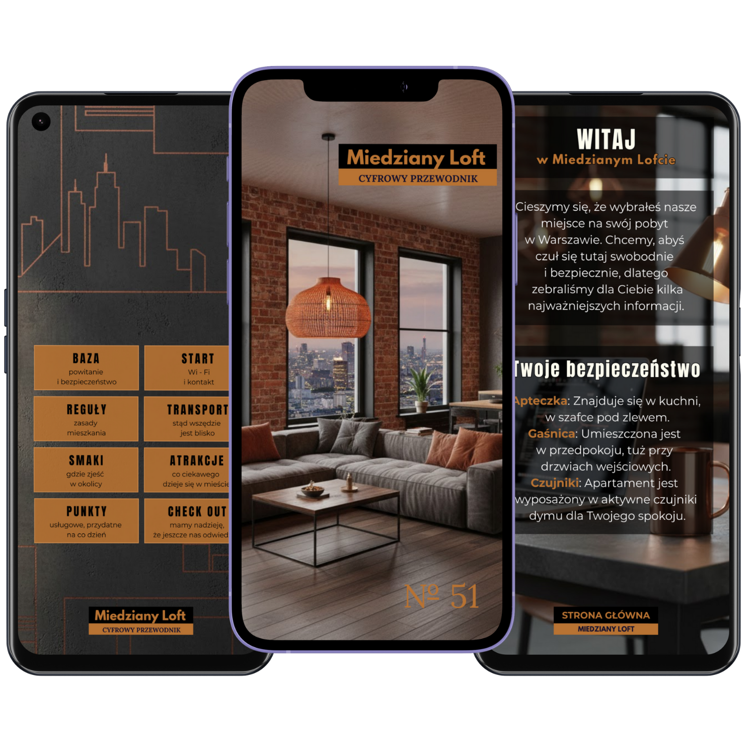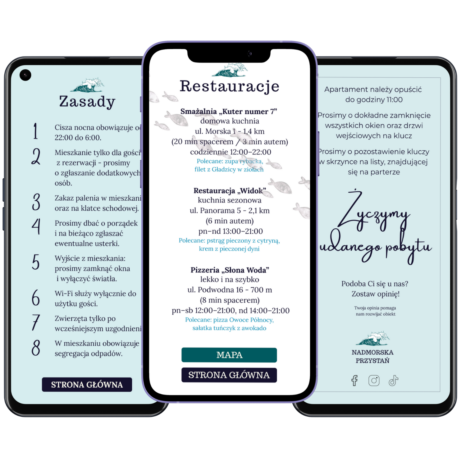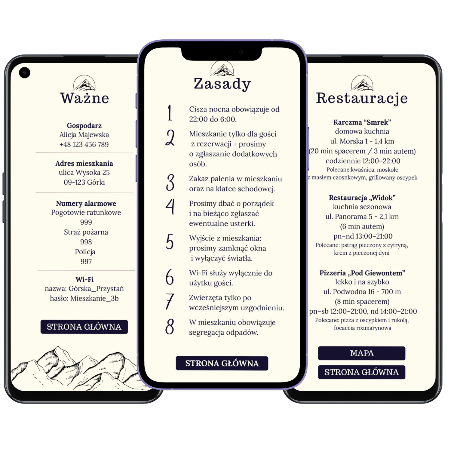 To gotowy materiał w formie cyfrowej (PDF / online), który możesz od razu udostępnić swoim gościom. Zawiera instrukcje, zasady pobytu oraz praktyczne informacje o mieszkaniu.